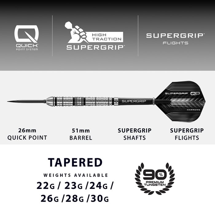 De Harrows Supergrip Tapered Quick Point 90% is een mooie slanke pijl met veel grip.