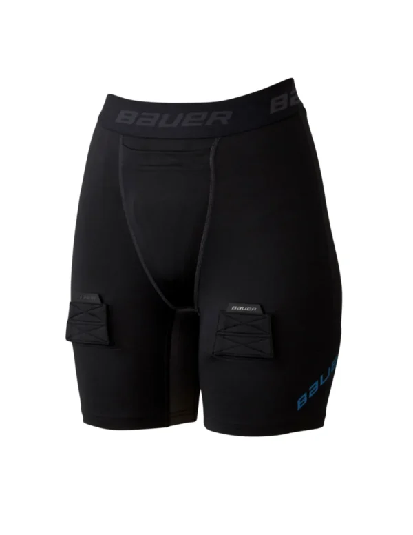 Strakke compressie Bauer Jill short met velcro klittenband om de kousen aan vast te maken.